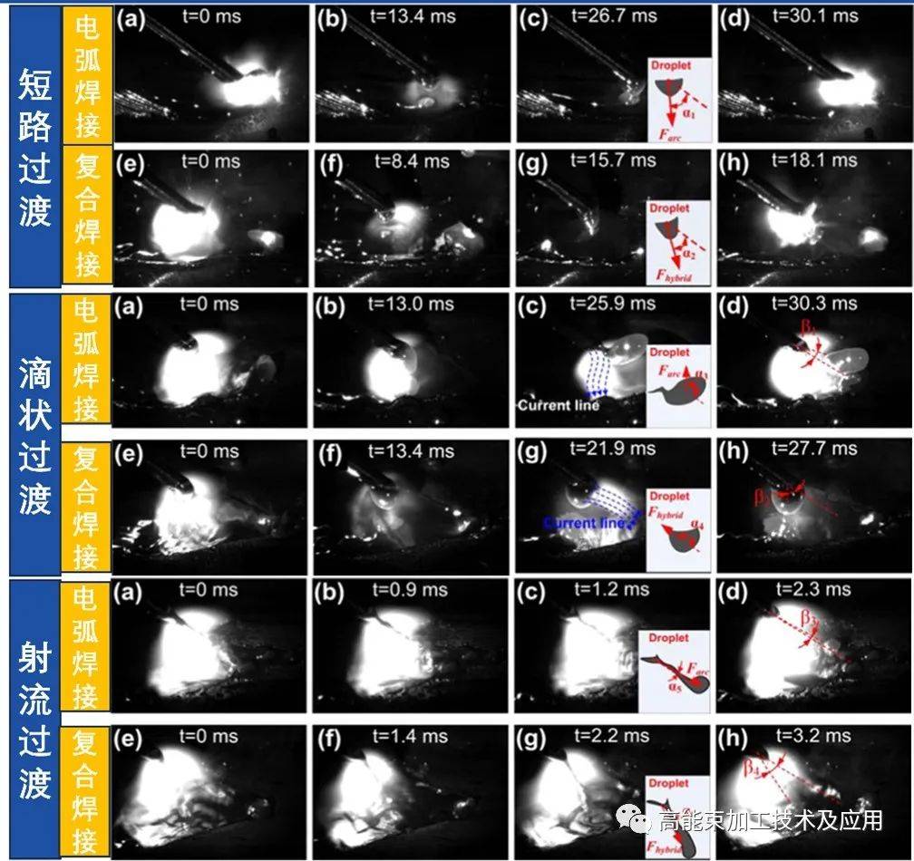 圖5 不同熔滴過渡模式下電弧焊接與復(fù)合焊接高速攝影對比