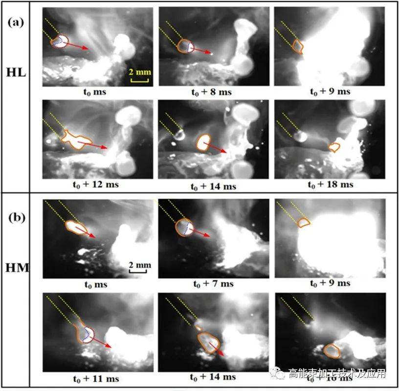 圖3 不同引導(dǎo)模式對焊接過程的影響: (a)激光引導(dǎo)模式; (b)電弧引導(dǎo)模式