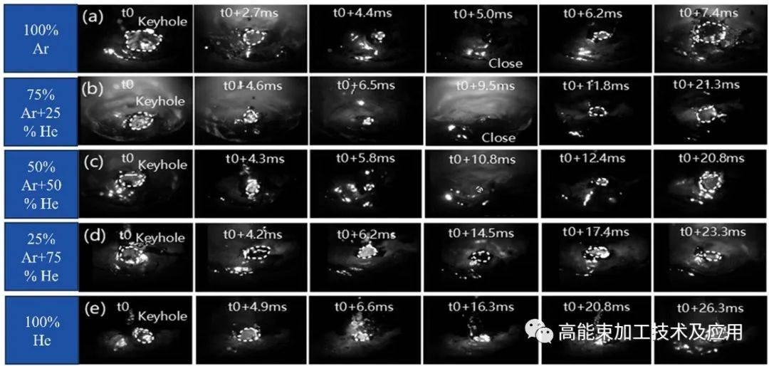 無論是單一的激光焊接還是電弧焊接,都應(yīng)該考慮保護氣體的重要性。在激光焊接中,保護氣體是消除等離子體屏蔽效應(yīng)、提高焊接工藝穩(wěn)定性、實現(xiàn)深熔焊接的有效手段。在電弧焊接中,保護氣體是實現(xiàn)電弧穩(wěn)定燃燒、決定電弧熱柱分布和熔滴過渡模式的關(guān)鍵因素。研究學(xué)者認(rèn)為添加30% He改善了激光與電弧的復(fù)合效應(yīng),熔滴過渡模式從不穩(wěn)定的噴射過渡轉(zhuǎn)變?yōu)榉€(wěn)定的噴射過渡,并且提高了旋轉(zhuǎn)噴射過渡與電弧脈沖周期的匹配度,電弧波形波動較小,焊縫成形較好,焊接缺陷較少。此外,研究學(xué)者認(rèn)為提高焊縫熔深和抑制氣孔缺陷的He體積百分比應(yīng)為50%。有效激光功率密度隨著He體積百分比的增加而增加,這有助于焊縫熔深的增加。由于在使用Ar-He混合氣的同時提高了小孔的穩(wěn)定性,因此有效地抑制了焊接氣孔缺陷,如圖4所示。