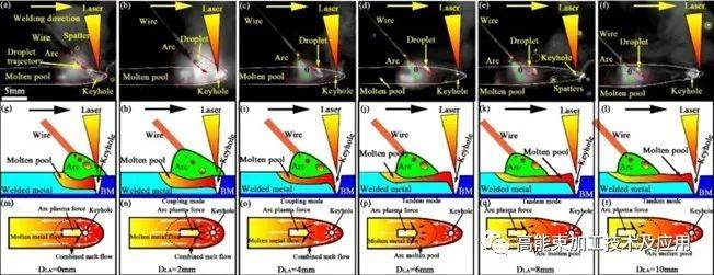 激光和電弧熱源在焊接方向上的相對位置對激光-電弧復(fù)合焊接有至關(guān)重要的影響。一些研究學(xué)者認(rèn)為激光引導(dǎo)模式優(yōu)于電弧引導(dǎo)模式。他們認(rèn)為激光引導(dǎo)模式可以獲得更加穩(wěn)定的焊接過程,可以得到較好的焊縫成形,氣孔和飛濺缺陷較少,并且具有更好的熔透性和更牢固的焊縫。然而,另一些研究學(xué)者認(rèn)為電弧引導(dǎo)模式優(yōu)于激光引導(dǎo)模式。他們認(rèn)為與超高功率激光引導(dǎo)模式相比,超高功率電弧引導(dǎo)模式形成了穩(wěn)定的電弧特性和熔池流動,熔滴半徑與焊接表面之間的角度產(chǎn)生了更大的推動力,促進了熔滴的分離,提高了焊接過程的穩(wěn)定性,焊接飛濺較少,焊縫成型較穩(wěn)定,如圖3所示。