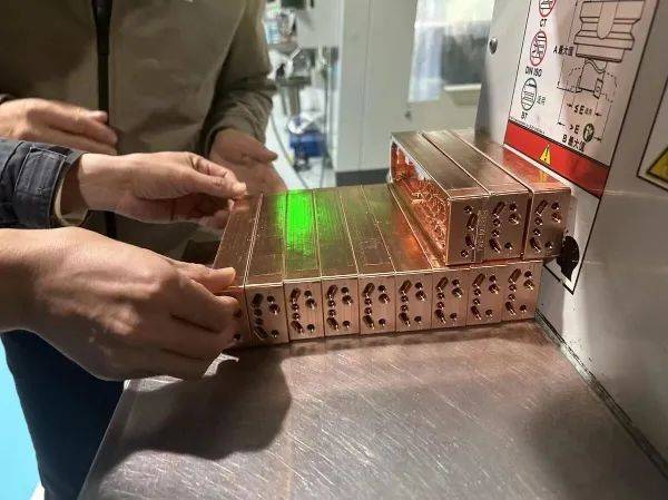 走進(jìn)熱刺激光的機(jī)加工車間,眼前幾十臺(tái)加工設(shè)備正閃著綠燈快速運(yùn)轉(zhuǎn),一條條紫銅原料通過(guò)自動(dòng)化設(shè)備一路完成開(kāi)粗、打孔、精加工等環(huán)節(jié),成為形似插線板的泵浦源外殼。