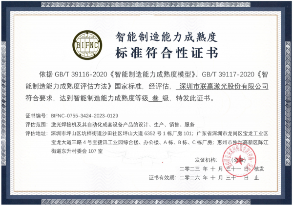 同月,按照評估標準GB∕T 39116-2020《智能制造能力成熟度模型》,國家智能制造能力成熟度評估(CMMM)評估組對深圳聯(lián)贏智能制造成熟度模型18個能力子域進行全面評估。通過現(xiàn)場巡視、人員訪談、系統(tǒng)演示和設備操作等方式,對聯(lián)贏激光產(chǎn)品的生產(chǎn)實現(xiàn)智能制造進行了全面的證據(jù)收集和驗證。聯(lián)贏激光成功通過評估,獲得了智能制造能力成熟度三級認證。這標志著公司在智能制造領(lǐng)域處于國內(nèi)先進水平,為激光行業(yè)發(fā)展智能制造樹立了標桿。