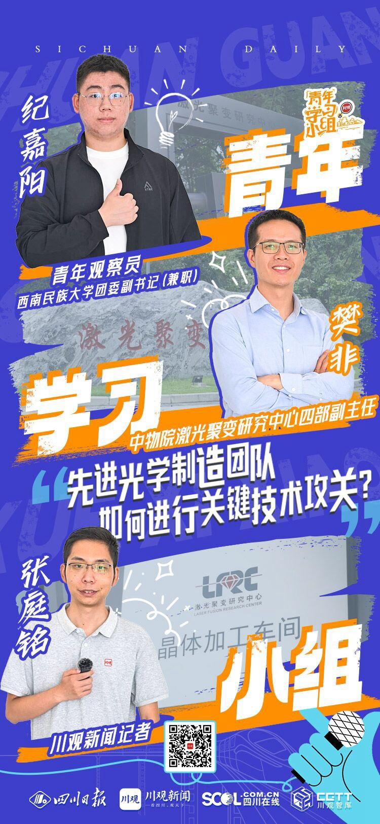 本期川觀青年學(xué)習(xí)小組,我們和青年觀察員西南民族大學(xué)團(tuán)委副書記(兼職)紀(jì)嘉陽同學(xué)一起,走進(jìn)中物院激光聚變研究中心先進(jìn)光學(xué)制造團(tuán)隊(duì)(以下簡稱“先進(jìn)光學(xué)制造團(tuán)隊(duì)”),去看看這個(gè)獲得了“四川青年五四獎(jiǎng)?wù)录w”的青年團(tuán)隊(duì)在關(guān)鍵技術(shù)攻關(guān)中做了哪些努力?