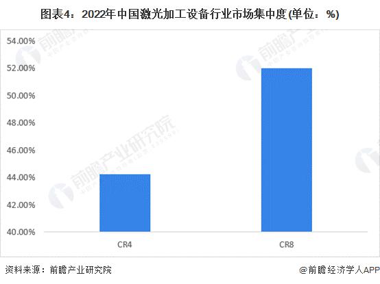 由于激光切割設(shè)備和激光打標(biāo)設(shè)備的通用性較強(qiáng),下游設(shè)備集成商門檻較低,本土中小企業(yè)眾多,因此中國激光加工設(shè)備行業(yè)市場集中度一般。2022 年,行業(yè) CR4 為 44% 左右,CR8 為 52% 左右。
