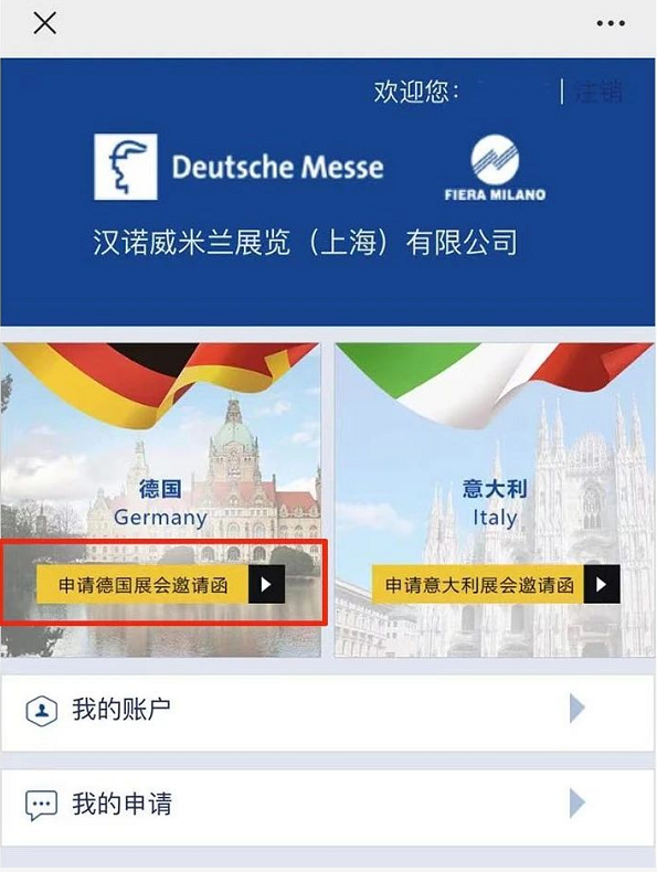 2. 注冊/登錄頁面,點(diǎn)擊“申請德國展會(huì)邀請函”