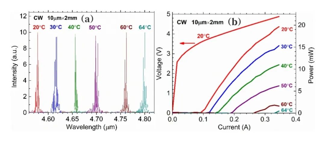 (a)4.6μm波長、2mm腔長、10μm脊寬的器件在20℃-64℃之間連續(xù)激射光譜;