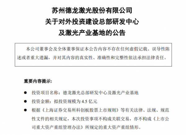 德龍激光方面稱,本次投資符合公司未來戰(zhàn)略布局,契合公司業(yè)務(wù)拓展需要,有助于加速提升配套生產(chǎn)能力。