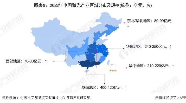 根據(jù)《2023 中國激光產(chǎn)業(yè)發(fā)展報告》,2022 年,包括廣西和廣東的華南地區(qū),激光產(chǎn)業(yè)規(guī)模為 400-420 億元,且呈上漲趨勢 ; 包括河南、湖北、湖南的華中地區(qū)激光產(chǎn)業(yè)規(guī)模為 210-220 億元,且呈上漲趨勢 ; 包括江蘇、安徽、上海、浙江、福建的華東地區(qū)激光產(chǎn)業(yè)規(guī)模為 240-250 億元,且呈上漲趨勢 ; 包括吉林、遼寧、北京、天津、河北的東北 / 華北區(qū)域產(chǎn)業(yè)規(guī)模為 80-90 億元,且呈下降趨勢,主要是由于近年來從北京遷出很多一些企業(yè),往沿海和東部地區(qū)發(fā)展 ; 包括陜西、四川、重慶的西部地區(qū)產(chǎn)值規(guī)模為 70-80 億元,且呈上漲趨勢。其中華南地區(qū)產(chǎn)值規(guī)模增長最快。