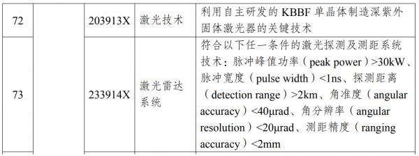 符合以下任一條件的激光探測(cè)及測(cè)距系統(tǒng)技術(shù):脈沖峰值功率(peak power)>30kW、脈沖寬度(pulse width)