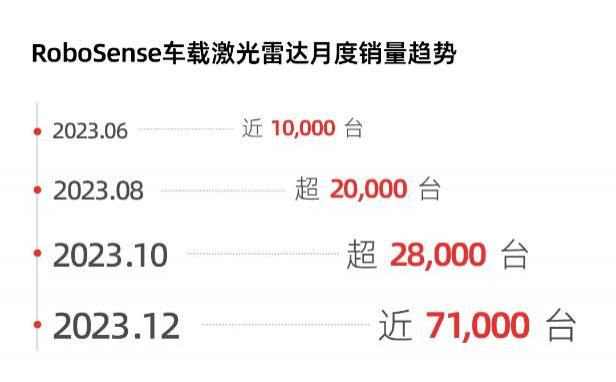 2023 年 12 月,速騰聚創(chuàng)車載激光雷達(dá)單月交付量近 7.1 萬臺(tái),不僅再度刷新了公司車載激光雷達(dá)單月交付記錄,且較同年 6 月增長(zhǎng)了 600% 以上。