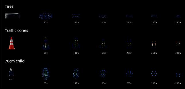 再來看啥叫明察秋毫,一覽無余。M3 擁有 0.05°×0.05° 的角分辨率,結(jié)合 300m@10% 的測(cè)距能力,可精準(zhǔn)捕捉到 140 米內(nèi)意外散落在地的黑色輪胎、280 米內(nèi)擺放路中的交通錐桶,以及 250 米內(nèi)闖入路中間的小孩等各類小物體,探測(cè)能力超強(qiáng)。即使遇到交通事故等極端路況的 Corner Case,M3 也能幫助智能汽車提前發(fā)現(xiàn)散落的障礙物,做到及時(shí)避讓,從而讓 L3 自動(dòng)駕駛速度上限提升至 120km/h。