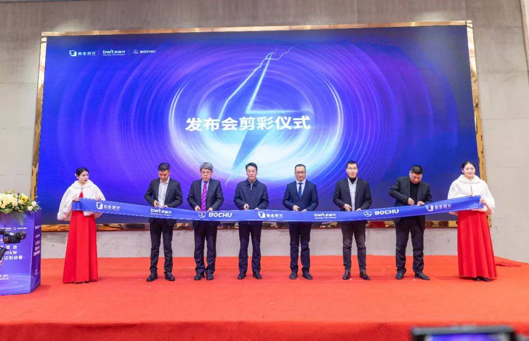 在合作剪彩儀式上,宿城區(qū)領導秦永輝,北京工業(yè)大學教授王璞、嘉泰激光總經理鄭長和、嘉泰激光研發(fā)副總陳大建、嘉泰激光物控副總湯孫槐、凱普林光纖事業(yè)部輪值總經理趙巨云共同上臺,宣告雷霆100kW超高功率切割設備正式發(fā)布。