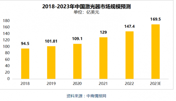 ??隨著科技的不斷進(jìn)步,激光器市場(chǎng)規(guī)模也在不斷擴(kuò)大。近年來(lái),中國(guó)激光器市場(chǎng)規(guī)模保持增長(zhǎng)趨勢(shì),2022年市場(chǎng)規(guī)模已達(dá)147.4億美元,同比增長(zhǎng)14.2%,占全球激光器市場(chǎng)73.3%的份額。預(yù)計(jì)2023年將繼續(xù)保持增長(zhǎng),市場(chǎng)規(guī)模將達(dá)169.5億美元。