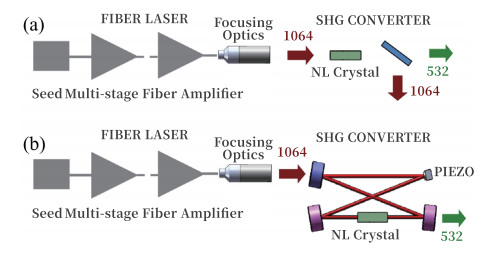 高功率固體激光器的發(fā)展歷程先于光纖激光器,在倍頻綠光方面也是如此。倍頻過程的轉(zhuǎn)換效率在很大程度上依賴于基頻光光強,與光纖激光器相比,固體激光器在高能量/峰值功率方面具有優(yōu)勢,在低功率時也可采用內(nèi)腔倍頻方式提高倍頻過程的轉(zhuǎn)換效率;而高功率光纖激光器的光譜容易因非線性效應(yīng)發(fā)生展寬,影響倍頻效率,其結(jié)構(gòu)特點也使其不便采用內(nèi)腔頻率變換方式。