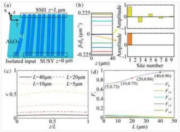 近年來(lái),超對(duì)稱(supersymmetry, SUSY)的概念逐漸從量子場(chǎng)論中延伸到光學(xué)領(lǐng)域。利用超對(duì)稱變換,可以靈活地調(diào)控光學(xué)勢(shì)(折射率),同時(shí)能夠保持系統(tǒng)的本征能譜的不變性。這為諸多采用傳統(tǒng)方法較難實(shí)現(xiàn)的光學(xué)器件提供了新的可能性,例如模式轉(zhuǎn)換與選擇、系統(tǒng)散射特性控制和高功率單模激光陣列等。值得一提的是,超對(duì)稱也具有調(diào)控系統(tǒng)拓?fù)涮匦缘臐摿?,有望成為激發(fā)準(zhǔn)確拓?fù)鋺B(tài)的可行方案。基于以上考慮,本工作將超對(duì)稱與拓?fù)涔鈭?chǎng)調(diào)控相結(jié)合,通過(guò)絕熱演化過(guò)程在一維波導(dǎo)結(jié)構(gòu)中產(chǎn)生了精確的拓?fù)淞隳#瑸橥負(fù)鋺B(tài)在光子集成等方面的應(yīng)用與新拓?fù)湫?yīng)的發(fā)現(xiàn)提供了更多可能性。