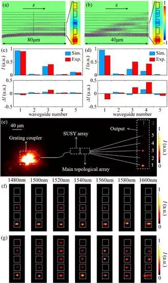 在仿真和實(shí)驗(yàn)中,研究人員設(shè)計(jì)了超對(duì)稱輸入的SSH波導(dǎo)陣列和作為對(duì)照的單波導(dǎo)輸入的SSH波導(dǎo)陣列。對(duì)這兩種結(jié)構(gòu)進(jìn)行全波仿真,超對(duì)稱輸入結(jié)構(gòu)激發(fā)出了準(zhǔn)確的模式,保持了良好的局域性,而單波導(dǎo)輸入陣列輸出的振幅和相位都發(fā)生了錯(cuò)亂(圖3(a,b))。在實(shí)驗(yàn)中,將1550 nm波長(zhǎng)的激光耦合輸入到界面附近的波導(dǎo),并將輸出端的信號(hào)引出(圖3(e))。測(cè)量得到超對(duì)稱輸入陣列的輸出與仿真和理論計(jì)算結(jié)果基本吻合,而單波導(dǎo)輸入陣列的輸出的局域性顯著變差(圖3(c,d))。此外,超對(duì)稱輸入陣列具有較好的寬帶性,而單波導(dǎo)輸入陣列的輸出隨波長(zhǎng)增大,其局域性變差(圖3(f,g))。