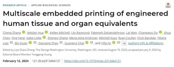 近日,大連理工大學(xué)機械工程學(xué)院趙丹陽教授課題組和美國內(nèi)華達大學(xué)雷諾分校機械工程系Yifei Jin課題組等團隊合作,針對多尺度復(fù)雜組織/器官體外精準(zhǔn)制造這一長期困擾生物打印領(lǐng)域的難題,提出了多尺度浸入式打印策略(Multiscale Embedded Printing,MSEP),實現(xiàn)了多尺度人體組織和器官的體外制造,從而有效驗證了MSEP技術(shù)在構(gòu)建復(fù)雜人體組織和器官方面的巨大潛力。該研究成果以“工程人體組織和器官等效物的多尺度浸入式打印”(Multiscale embedded printing of engineered human tissue and organ equivalents)為題發(fā)表于美國國家科學(xué)院官方學(xué)術(shù)期刊《美國國家科學(xué)院院刊》(Proceedings of the National Academy of Sciences ,PNAS)。