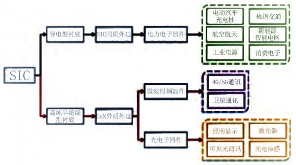 SiC半導體具有禁帶寬度大、擊穿電場高、熱導 率高的性能優(yōu)勢,在高功率、高頻率環(huán)境下能保持 較高的效率,并且具有較強的耐高溫能力和抗輻射 能力。SiC已成為大功率微波射頻器件與高電壓電力 電子器件的主要襯底材料,在衛(wèi)星通訊、高壓輸變 電、軌道交通、電動汽車、通訊基站、國防軍工等 領域有重要的應用前景(如圖1所示)。據估算,SiC 基半導體器件可使大數據中心能耗降低50%,特高壓 電網損耗降低60%,新能源汽車續(xù)航里程提高20%以 上,軌道交通功率器件系統(tǒng)損耗降低20%以上,工業(yè) 電機節(jié)能30%。目前,SiC等寬禁帶半導體已被列入 我國“十四五”發(fā)展規(guī)劃,成為在國家層面重點發(fā) 展的關鍵技術。