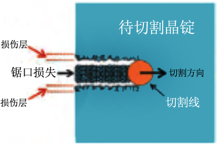 從晶錠到合格襯底片,目前國內SiC晶體加工 產線普遍使用的加工流程主要分為磨平、滾圓、切 割、粗研磨、精研磨、機械拋光、化學機械拋光、 清洗、檢測等多道工序,其中用于SiC晶體切片的 多線切割過程是SiC加工損失的主要來源。如圖2所 示,與切割線直徑相近的SiC材料會被磨削成碎屑 (150~250 μm),稱為鋸口損失(Kerf Loss),而 切割線的高速行走過程還會造成20~50 μm的粗糙起 伏與表面/亞表面結構損傷,必須通過后續(xù)磨拋工藝 去除,總材料損耗量占原材料的30%~50%。此外, 因多線切割過程需使用液體進行磨削、鋸口冷卻與 碎屑沖洗,不可避免地產生大量含硅廢水,廢水中 微米至納米粒徑的顆粒物難于絮凝,回收難度大, 易造成嚴重的環(huán)境污染。