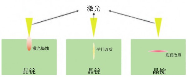 如圖3所示,常規(guī)的激光加工是利用燒蝕效應 或平行改質技術。這類技術是將材料沿激光入射方 向進行分離,僅可用于晶圓上的芯片分割。激光垂 直改質技術利用可穿透晶體的一定波長的激光,通 過特殊設計的激光光學系統(tǒng),在晶體內部極窄的深 度范圍內實現(xiàn)高密度光吸收,從而令晶體材料發(fā)生 化學鍵斷裂與分解、激光誘導電離、熱致開裂等一 系列物理化學過程。使用激光束在整個晶體表面掃 描,即可形成垂直于激光入射方向的改質層。