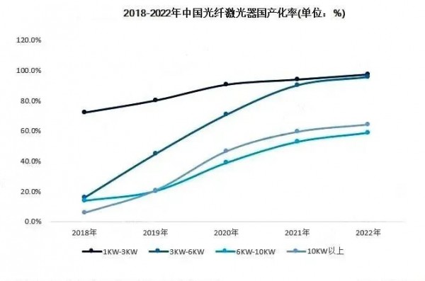 根據(jù)中國(guó)科學(xué)院武漢文獻(xiàn)情報(bào)中心發(fā)布的數(shù)據(jù),從市場(chǎng)滲透率來看,在1-3KW功率段光纖激光器市場(chǎng),2022年國(guó)產(chǎn)光纖激光器市場(chǎng)份額達(dá)97.3%,已基本實(shí)現(xiàn)國(guó)產(chǎn)化;在3-6KW功率段光纖激光器市場(chǎng),國(guó)產(chǎn)激光器滲透率由2018年的15.8%迅速提升至2022年的95.7%;在6-10KW功率段光纖激光器市場(chǎng),2022年國(guó)產(chǎn)滲透率達(dá)到58.6%。