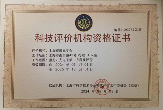 由上海市科學(xué)技術(shù)協(xié)會科技評價工作委員會組織的科技評價機(jī)構(gòu)資格評審會于2023年12月29日在上海市科學(xué)會堂進(jìn)行,上海市激光學(xué)會成功通過復(fù)審,2024年1月1日發(fā)布最新的科技評價機(jī)構(gòu)資格證書。