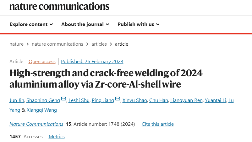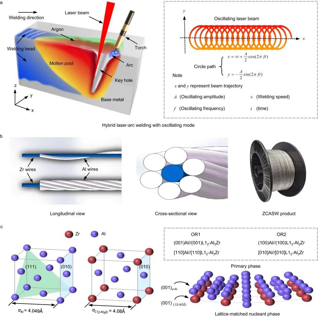 據(jù)悉,《自然·通訊》(Nature Communications)在線刊發(fā)了華中科技大學(xué)機(jī)械科學(xué)與工程學(xué)院蔣平教授團(tuán)隊(duì)關(guān)于高強(qiáng)鋁合金激光焊接凝固裂紋缺陷抑制的最新研究成果,論文題目:“High-strength and crack-free welding of 2024 aluminium alloy via Zr-core-Al-shell wire(基于“鋯芯鋁殼”焊絲的2024鋁合金高強(qiáng)度和無裂紋焊接)”。