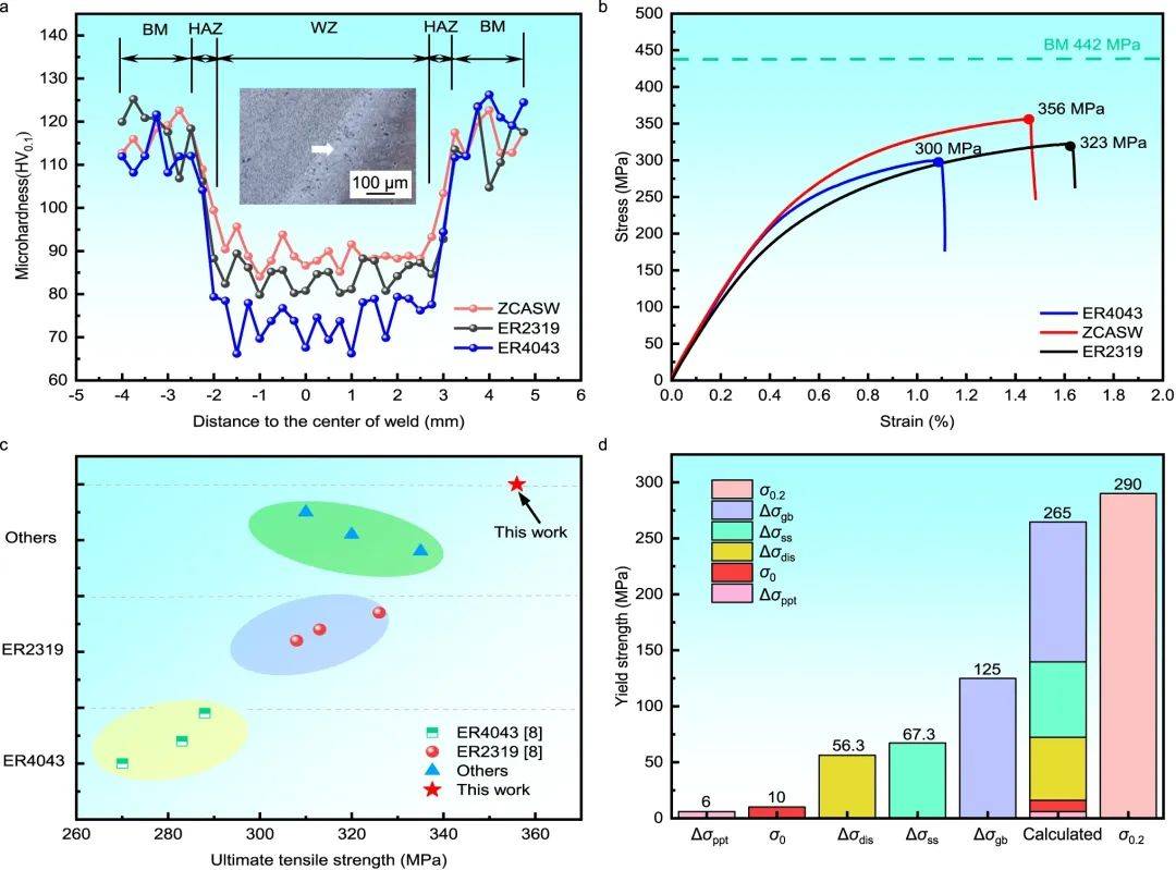 焊接接頭在無熱處理的條件下平均抗拉強(qiáng)度為349 MPa,達(dá)到2024-T4態(tài)高強(qiáng)鋁合金熔化焊接目前公開文獻(xiàn)報(bào)道的最優(yōu)水平?;趶?qiáng)化機(jī)制,定量分析了細(xì)晶強(qiáng)化、第二相強(qiáng)化、位錯(cuò)強(qiáng)化和固溶強(qiáng)化對(duì)力學(xué)性能的貢獻(xiàn),發(fā)現(xiàn)細(xì)晶強(qiáng)化是導(dǎo)致力學(xué)性能提高的主要原因,為接頭強(qiáng)度提高貢獻(xiàn)47%。