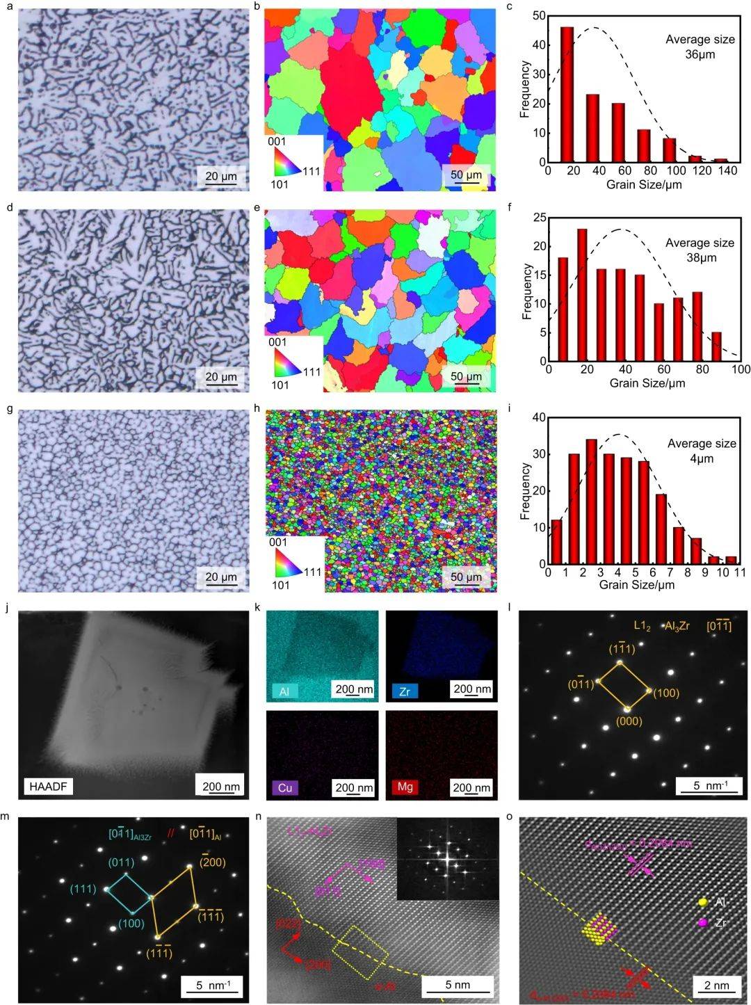 利用超景深光學(xué)顯微鏡、EBSD和TEM等多種表征方法,分析了焊縫截面的微觀結(jié)構(gòu)特征,發(fā)現(xiàn)焊縫內(nèi)部為均勻細(xì)小的非枝晶等軸晶組織,平均晶粒尺寸僅為4 μm,這種超細(xì)等軸晶組織的形成能夠有效抑制凝固裂紋缺陷。進(jìn)一步闡明了含鋯形核相(Al3Zr)與母相(α-Al)完全共格的晶體學(xué)匹配關(guān)系,揭示了熔池凝固過程中超細(xì)等軸晶的異質(zhì)形核機(jī)制。