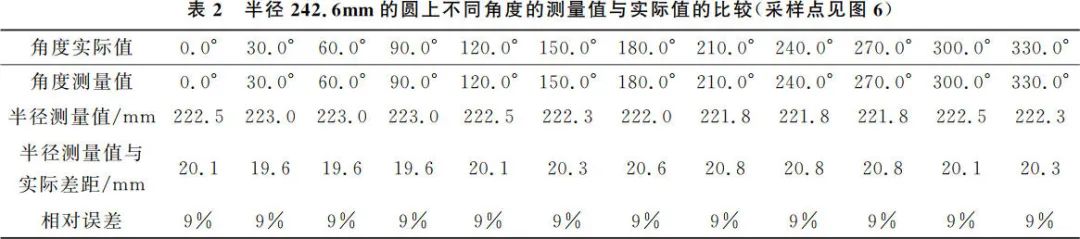 如圖 6 所示,選取標號為 1~12 的 12 個相同半徑 r=242.6mm 的采樣點,即激光雷達與 12 個不同采樣點的距離相同,都是 242.6 mm為實際距離,進行距離和角度測量,計算測量值相對實際值的差距及相對誤差,測量數(shù)據(jù)結(jié)果如表 2 所示,角度結(jié)果保留小數(shù)點后 1 位的情況下,測量可以認為準確,誤差可以被忽略,測量距離與實際值之間的差距在 20mm 范圍擺動,測距相對誤差保留一位有效數(shù)字時為 9%,12 個采樣點一致。結(jié)合不同距離,相同角度下測量值與實際值的差距略大于 20mm(表 1),說明定位系統(tǒng)的誤差主要來源于距離測量,方位角相對距離對定位結(jié)果的影響可以忽略不計。