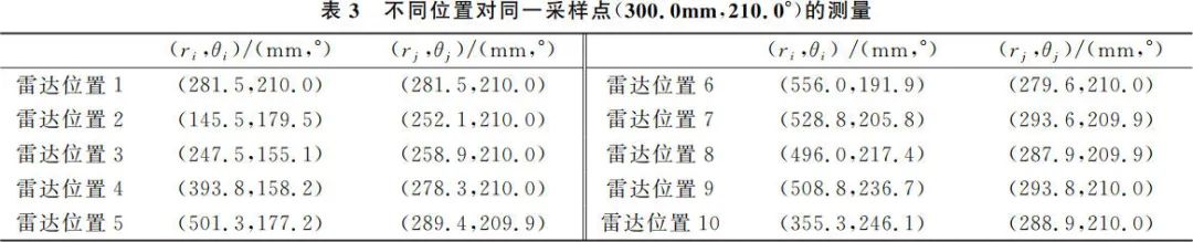 圖 7 雷達位置 1 為定位系統(tǒng)坐標原點,激光雷達在 10 個不同位置對 M 點進行定位,結(jié)果如表 3 所示。取 10 次測量值的坐標經(jīng)過平移后的平均值