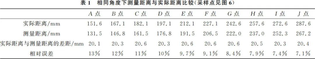所以經(jīng)過測量系統(tǒng)定位的 M 點的坐標為 M(280.4mm,210.0°)。定位點實際坐標 M(300.0mm,210.0°),測距誤差 Δr=300.0-280.42≈20mm,角度誤差為 0,與前面相同角度下不同距離采樣點的測量以及相同距離下不同角度采樣點的測量的驗證結(jié)果相符,定位誤差主要來自測距,約 20mm。