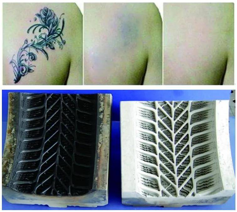 (5)其他方面:以往在醫(yī)療領(lǐng)域中,人們經(jīng)常使用化學(xué)藥劑來清洗患者的紋身,但是,這種方法不僅不能徹底清除掉皮膚上的色素,而且會(huì)損害皮膚的健康,甚至還會(huì)留下疤痕或產(chǎn)生炎癥。但采用激光清洗技術(shù)對患者的紋身進(jìn)行清洗時(shí),激光只會(huì)對皮膚表面產(chǎn)生輕微的燒灼作用,并不會(huì)對患者的皮膚造成嚴(yán)重傷害,皮膚內(nèi)部的色素微粒將被激光傳送的能量粉碎,然后通過細(xì)胞自身的代謝過程可被完全分解,如圖所示。激光清洗的范圍還在不斷擴(kuò)大,目前已用于海面泄露石油、發(fā)動(dòng)機(jī)積碳、城市涂鴉、牙齒、生物戰(zhàn)劑、毒劑等。