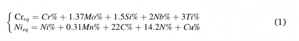焊接是一個(gè)高溫過程,包括熔化材料,然后冷卻和凝固。焊接接頭的最終微觀結(jié)構(gòu)是凝固相變的結(jié)果。在不銹鋼的情況下,預(yù)測(cè)微觀結(jié)構(gòu)特征通常涉及確定凝固性,使用Creq/Nieq比率的離子模式。對(duì)于奧氏體不銹鋼,計(jì)算Creq/Nieq比率的常用公式如下: