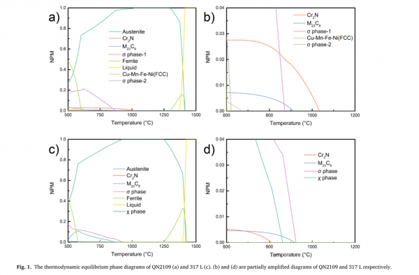 圖1顯示了使用Thermo-Calc軟件計(jì)算的兩種奧氏體不銹鋼QN2109和317 L的熱力學(xué)平衡相圖。在大約1400°C時(shí),兩種鋼完全熔化成單一液相,表明任何可能的沉淀(如σ相、M23C6和Cr2N)溶解。冷卻時(shí),首先出現(xiàn)δ-鐵素體(由淺綠線表示),隨后逐漸形成奧氏體(由深綠色線表示)。此外,與QN2109相比,317 L中δ-鐵素體的含量更高,相應(yīng)的溫度范圍更寬。