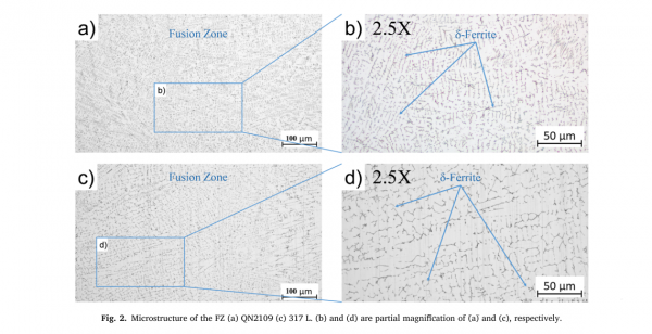 Creq/Nieq比率是預(yù)測(cè)相變過程的有價(jià)值的指標(biāo),但僅在熱力學(xué)平衡條件下。由于激光焊接過程中的快速冷卻速率和動(dòng)態(tài)動(dòng)力學(xué)過程,相變可能不完全,導(dǎo)致殘余δ-鐵素體在FZ中持續(xù)存在。這可能導(dǎo)致形成包含δ-鐵素體和奧氏體的雙相顯微組織。圖2示出了熔合區(qū)的微觀結(jié)構(gòu)。值得注意的是,兩種焊接接頭中的δ-鐵素體枝晶形態(tài)不同,QN2109的骨架鐵素體比例高于317 L中觀察到的游離鐵素體。為了量化鐵素體含量,使用了ImageJ。五個(gè)視野的平均值得出QN2109和317 L焊縫的鐵素體含量分別為13.68±0.46%和6.71±0.58%。