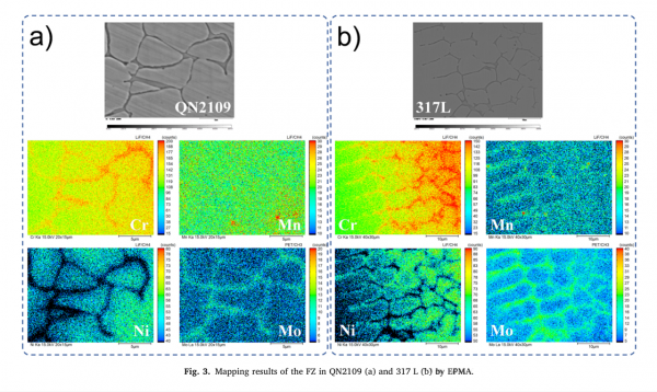 ONH分析儀測(cè)試結(jié)果顯示QN2109的N含量在激光焊接后顯著降低,從0.23重量%降至0.10重量%。圖3顯示了使用EPMA對(duì)FZ進(jìn)行制圖的結(jié)果。對(duì)于兩種類型的焊接接頭,δ-鐵素體相表現(xiàn)出鉻和鉬Mo的富集,而奧氏體相表現(xiàn)出鎳的富集。此外,Mn在兩相之間的分布不同。在QN2109焊縫的FZ中,Mn主要分布在奧氏體相中,而在317 L中,Mn主要出現(xiàn)在δ-鐵素體相中。
