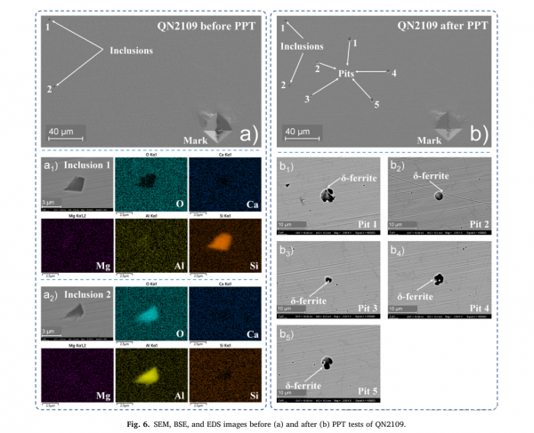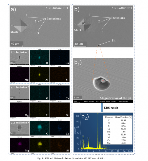 圖8顯示了317 L在PPT測(cè)試前后的微觀結(jié)構(gòu)。原始視野顯示了由Al2O3組成的三種典型夾雜物,其可能還包含MgO作為核,被CaO和SiO2作為殼覆蓋(圖8(a1)、(a2)和(a3)。PPT試驗(yàn)后,這些夾雜物不會(huì)引發(fā)點(diǎn)蝕,而在沒有夾雜物的位置觀察到一個(gè)坑。根據(jù)EDS結(jié)果,蝕坑的放大圖如圖8(B1)所示,內(nèi)部殘留的白色顆粒含有大量的鉻和碳。參考熱力學(xué)平衡相圖(圖1(c)),確認(rèn)該粒子為M23C6。