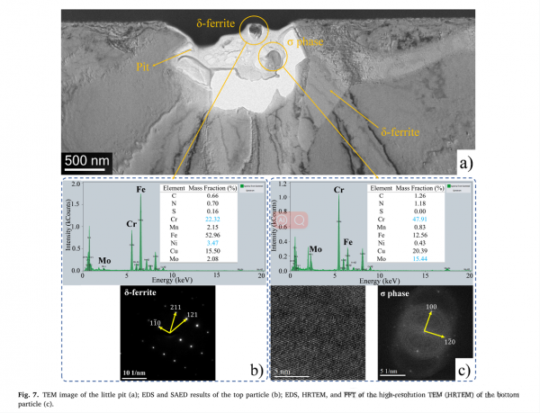 二次奧氏體通常具有較低的鉻含量,并且更容易發(fā)生脆性斷裂。如第3.2.2節(jié)所述,PPT后在QN2109焊件的凹坑附近發(fā)現(xiàn)了δ-鐵素體。此外,圖7中的TEM觀察揭示了σ相和δ-鐵素體在凹坑內(nèi)共存,而二次奧氏體的缺失表明它已經(jīng)完全溶解。因此,共晶反應(yīng)生成的二次奧氏體是qn 2109 FZ點(diǎn)蝕開始的原因。關(guān)于317 L,圖8(b)示出了在位于BM的凹坑內(nèi)檢測(cè)到M23C6。觀察到碳化鉻的形成伴隨著周圍區(qū)域鉻濃度的降低,表明317 L激光焊接點(diǎn)蝕的初始位置是M23C6的存在。