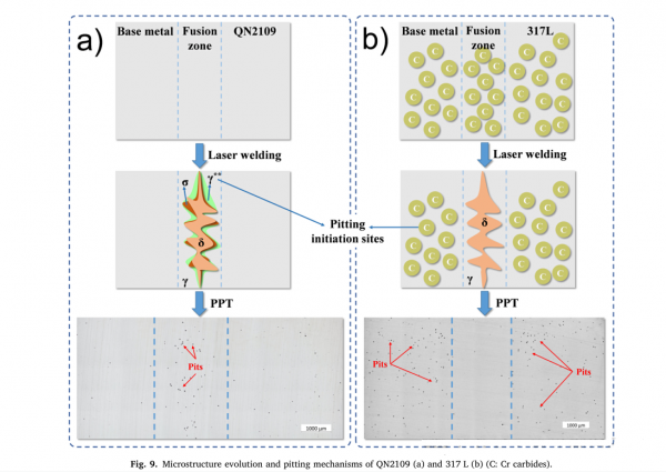 如圖9所示,兩種奧氏體不銹鋼激光焊接后微觀結(jié)構(gòu)變化導(dǎo)致的點(diǎn)蝕機(jī)理解釋如下。在QN2109的情況下,在液相凝固過程中形成δ-鐵素體,隨后發(fā)生共析反應(yīng),產(chǎn)生σ相和二次奧氏體。這反過來又增加了點(diǎn)蝕起始位點(diǎn)的數(shù)量(γ * *),最終導(dǎo)致QN2109焊接接頭的整體抗點(diǎn)蝕性降低。相反,在317 L中,碳化鉻均勻地分散在BM中。根據(jù)圖1(c)中描繪的熱力學(xué)平衡相圖,在FZ中,Cr碳化物在高溫下溶解到液相中。然而,由于激光焊接的高冷卻速率和低熱輸入,Cr碳化物沒有足夠的時(shí)間沉淀。因此,F(xiàn)Z點(diǎn)蝕萌生位置的數(shù)量減少,從而減少了317 L焊接接頭中的點(diǎn)蝕萌生,并提高了其抗點(diǎn)蝕性。