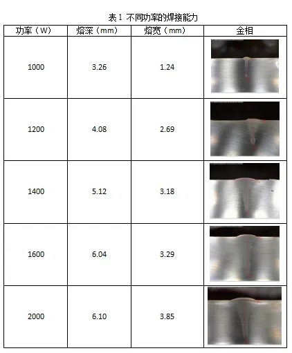 使用搭載銳科焊將系列RFL-C025H手持焊專用激光器的激光設備,在不銹鋼上進行堆焊。在其他工藝參數(shù)不變的情況下,改變激光器輸出功率,分別觀察焊接后的熔深熔寬。詳細數(shù)據(jù)如下表1所示??梢园l(fā)現(xiàn),隨著功率升高,焊接后的熔深越深,熔寬越寬。說明激光器的功率越高,手持焊設備的焊接能力越強。表1展示了不同功率激光的焊接能力。
