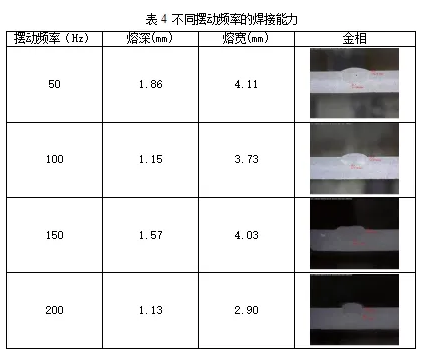 在搭載銳科焊將系列RFL-C015H1手持焊專用激光器的激光設備上焊接鋁合金,分別控制單變量為擺幅和擺動頻率,觀察焊接后的熔深和熔寬,分別如下表3、4所示。可以發(fā)現(xiàn),隨著擺幅的增加,焊縫表面的寬度明顯變大,但當擺幅為4、5mm時,焊接頭的擺動速度會達不到要求,焊縫表面形貌表面不連續(xù);隨著頻率的增加,焊接熔深變低,但當頻率超過100Hz時,表面形貌也變成不連續(xù)。