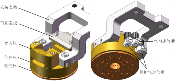 同軸氣流裝置整體結(jié)構(gòu)如圖4.1所示,裝置結(jié)構(gòu)主要包括氣腔環(huán)、噴氣板、導(dǎo)向塊、氣簾蓋板、進(jìn)氣嘴及安裝支架。
