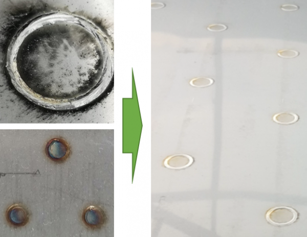 激光焊接具有速度快、深度大、變形小的特點(diǎn),但在激光深熔焊過程中,高能量密度的激光束作用于金屬材料時(shí),材料不僅熔化,而且氣化,在熔池上方形成金屬蒸氣,對激光束具有干擾作用,如圖3.1所示,若處理不當(dāng),金屬蒸氣將沉積附著于工件表面,對工件表面形成明顯污染,同時(shí)帶來焊接飛濺和咬邊等焊接缺陷,如圖3.2所示。換熱板焊縫密集,金屬蒸氣污染將影響相鄰焊縫的焊接質(zhì)量和焊接穩(wěn)定性,對于大幅面換熱板,如長度10米,寬度2米,焊縫總數(shù)量可達(dá)1萬個(gè)以上,必須焊好每一條焊縫,才能保證整板焊接質(zhì)量,同時(shí),如何避免焊縫氧化,達(dá)到良好保護(hù),是實(shí)現(xiàn)高品質(zhì)焊接的重要方面。為達(dá)到良好的保護(hù)效果,需兼顧兩方面,一是需要對熔池位置進(jìn)行保護(hù),二是需要對離開熔池的高溫焊縫繼續(xù)施加保護(hù)氣體,即焊縫延時(shí)保護(hù)。因此,實(shí)現(xiàn)大幅面換熱板高穩(wěn)定性、高品質(zhì)焊接的關(guān)鍵在于金屬蒸氣擴(kuò)散和焊縫全保護(hù)控制。