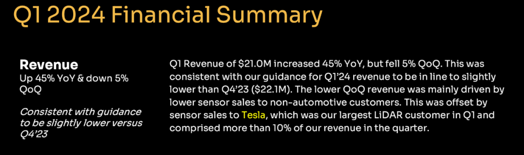 Luminar報(bào)告稱:“特斯拉是我們第一季度最大的激光雷達(dá)客戶?!彪m然公司一季度收入環(huán)比有所下降(主要是由于來(lái)自非汽車客戶的銷量下滑),但是由于特斯拉的大量購(gòu)買,這種下滑得到了一定緩解。