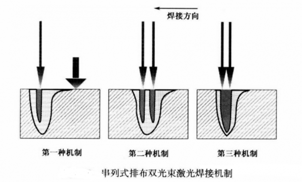 對(duì)于串列式排布的雙光束激光焊接系統(tǒng),根據(jù)前后兩個(gè)光束間距的不同,存在三種不同的焊接機(jī)制,如下圖所示。
