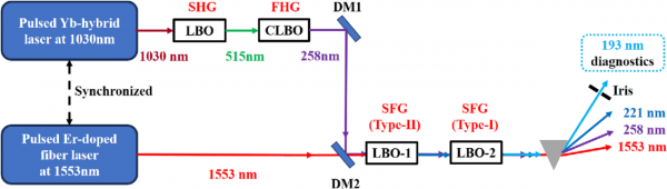 圖1:193 nm 激光系統(tǒng)的實驗裝置。SHG:二次諧波發(fā)生;FHG:四次諧波發(fā)生;SFG:和頻發(fā)生;DM1:AR@515 nm/HR@258 nm 二向色鏡;DM2:HR@258 nm/AR@1553 nm 二向色鏡。資料來源:張志韜 等人,《High-power, narrow linewidth solid-state deep ultraviolet laser generation at 193 nm by frequency mixing in LBO crystals》,《Advanced Photonics Nexus》(2024)。