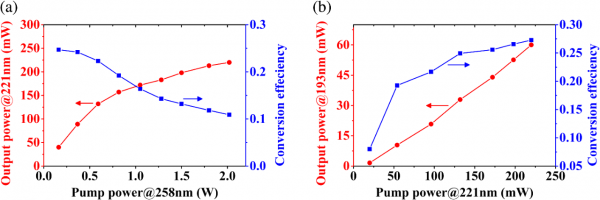 圖3:LBO 晶體中第一個和第二個 SFG 產(chǎn)生的 (a) 221 nm 激光和 (b) 193 nm 激光的輸出平均功率分別與 258 nm 和 221 nm 激光的泵浦平均功率的函數(shù)關(guān)系。資料來源:張志韜 等人,《High-power, narrow linewidth solid-state deep ultraviolet laser generation at 193 nm by frequency mixing in LBO crystals》,《Advanced Photonics Nexus》(2024)。