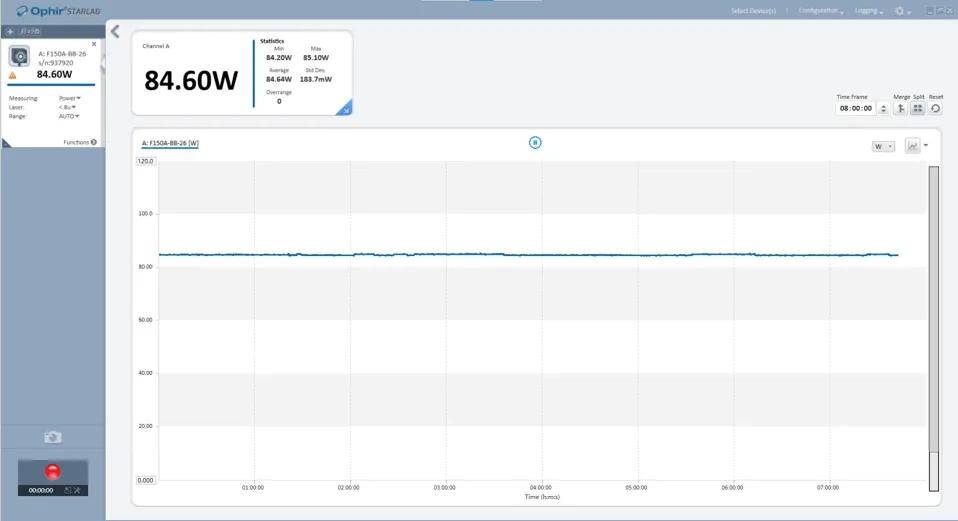 在工程實踐中,我們的二倍頻模塊對倍頻效率和中低功率的相位匹配條件做了保留,重點關(guān)注高功率注入下的綠光性能,這也符合后面四倍頻模塊有效諧波轉(zhuǎn)換的要求。處于系統(tǒng)穩(wěn)定性的考慮,對二倍頻激光功率穩(wěn)定性做了長時間的監(jiān)測,從實測數(shù)據(jù)看,其功率穩(wěn)定性優(yōu)于0.22%,8小時連續(xù)測量功率平均值84.6W(圖3)。