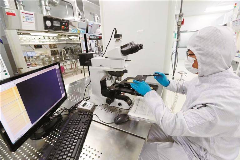 公司科研團(tuán)隊(duì)正在對(duì)高功率半導(dǎo)體激光芯片進(jìn)行圖形檢測(cè)。